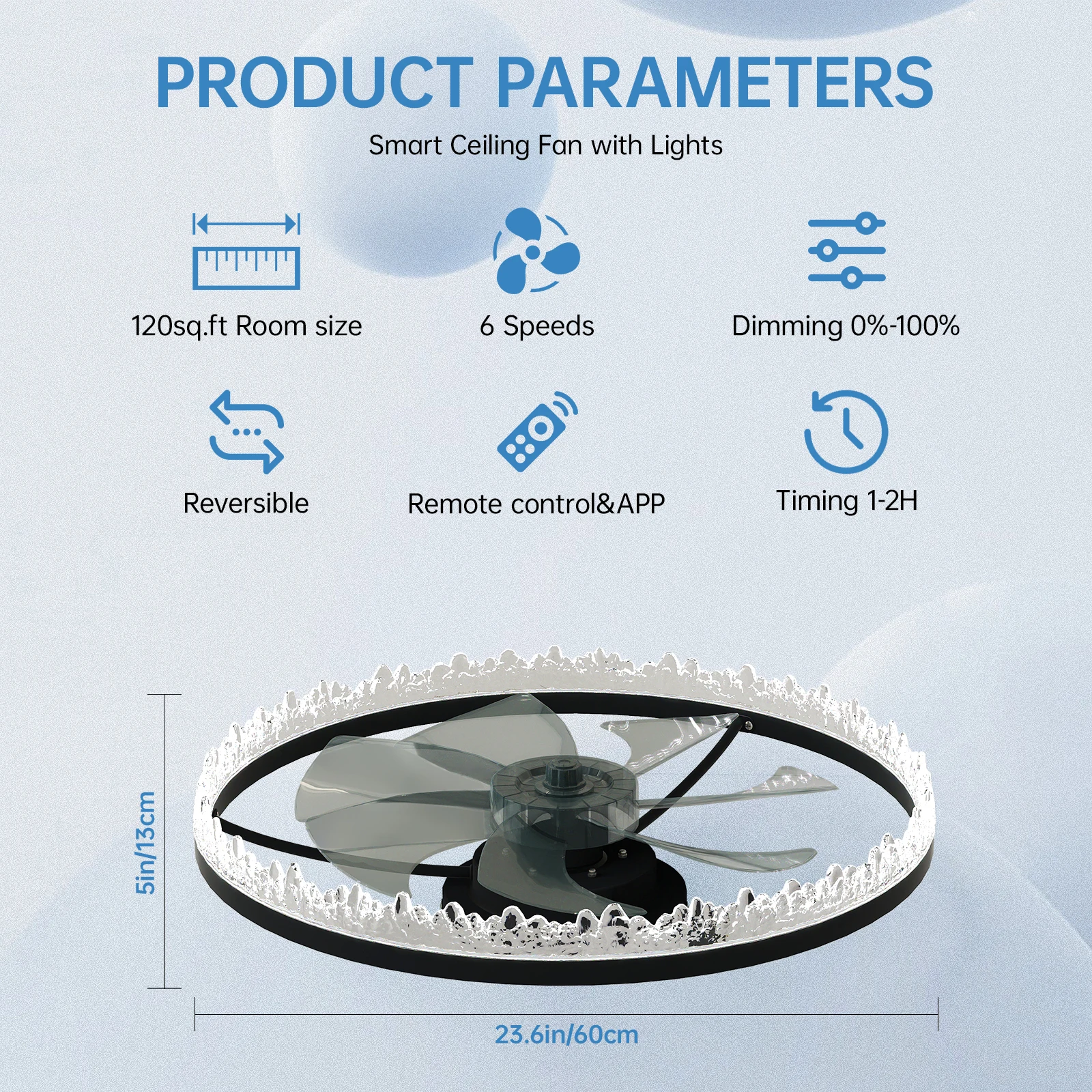 Upgrade your home with the ARLGSITE 24-Inch Smart Black Ceiling Fan with Light, designed for elegance, comfort, and functionality. This modern flush mount ceiling fan combines a luxurious crystal-ring design with energy-efficient LED lighting and a powerful silent motor. Its sleek low-profile design is perfect for bedrooms, dining rooms, and living spaces with low ceilings.