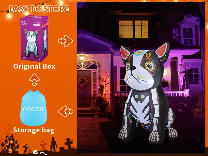Get into the spooky spirit with the GOOSH 5ft Halloween Inflatable Skeleton Bulldog! Perfect for Halloween parties, yard displays, or Day of the Dead celebrations, this inflatable decoration adds a fun and spooky vibe to your outdoor space.