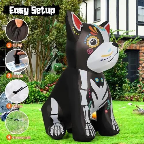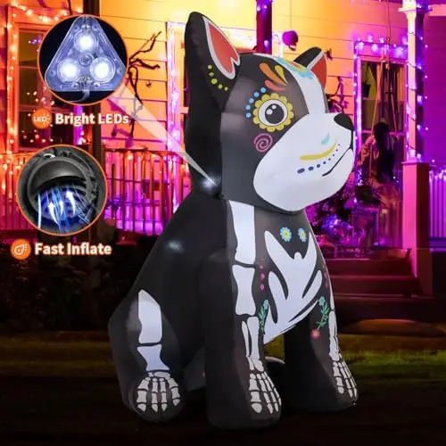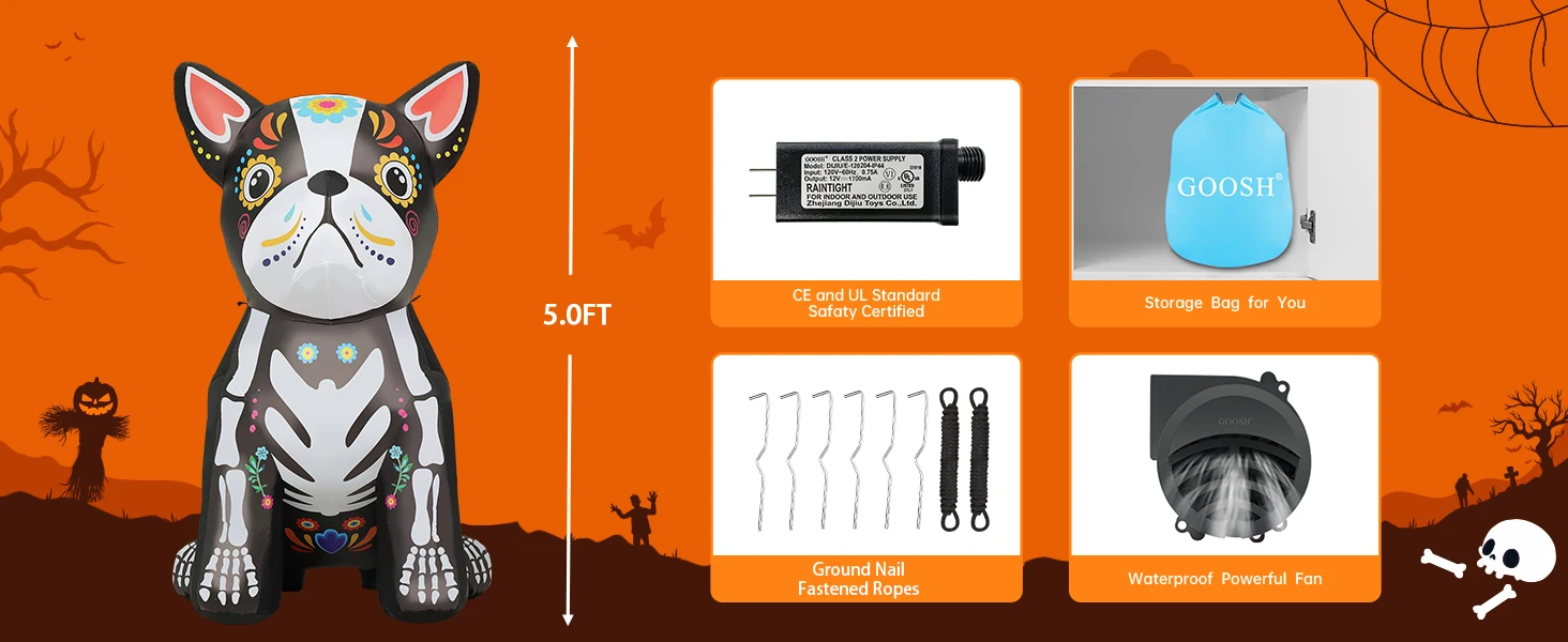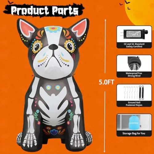 Celebrate Halloween with the GOOSH 5FT Inflatable Skeleton Bulldog, a spooky yet fun decoration that will capture everyone’s attention. Designed with bright built-in LED lights, this inflatable bulldog creates a glowing effect, making it perfect for night displays in your yard, garden, or lawn. Its skeleton-style design adds a unique twist to your outdoor Halloween decorations, sure to delight kids and guests alike. Easy to set up, durable, and weather-resistant, this inflatable is a must-have addition to your Halloween party supplies.