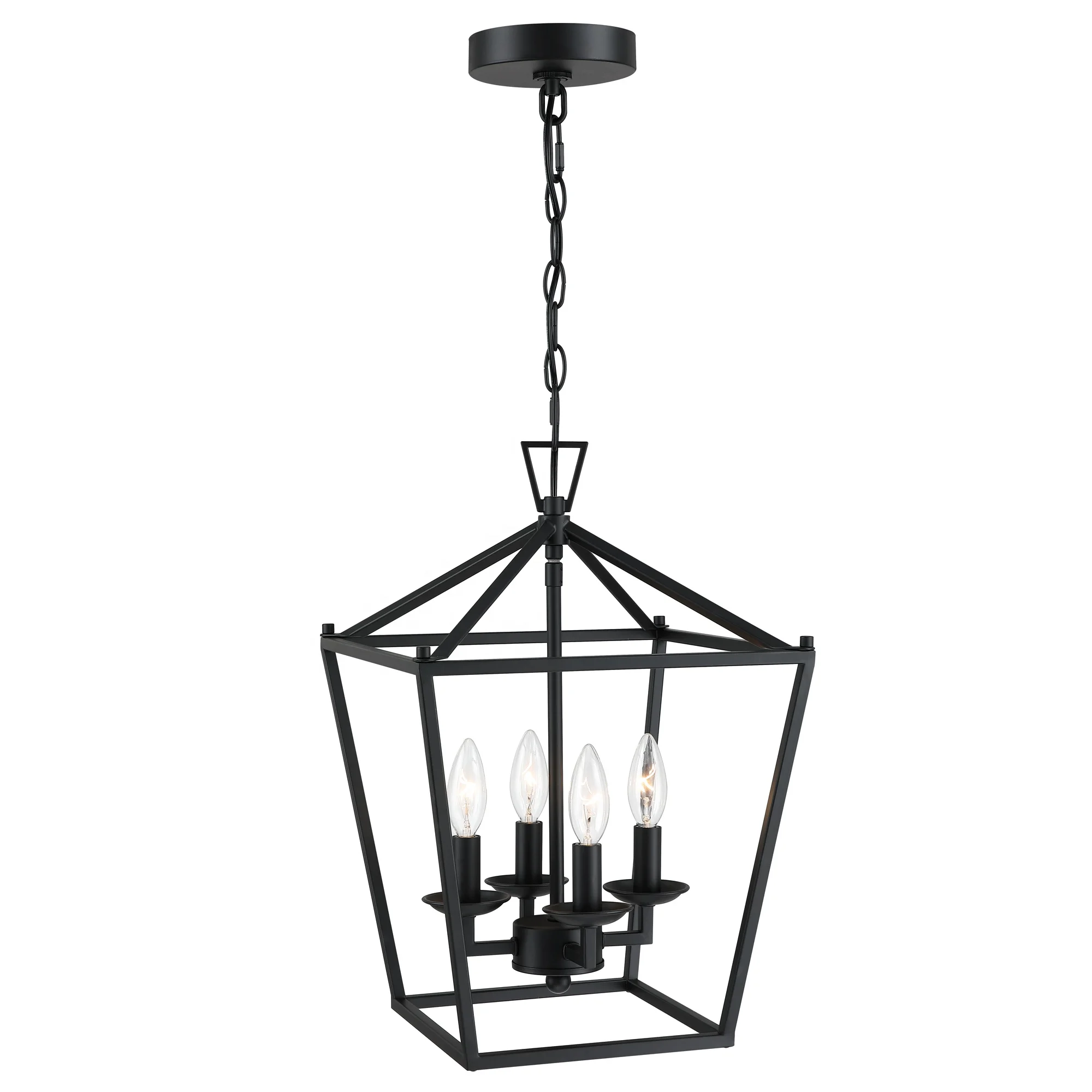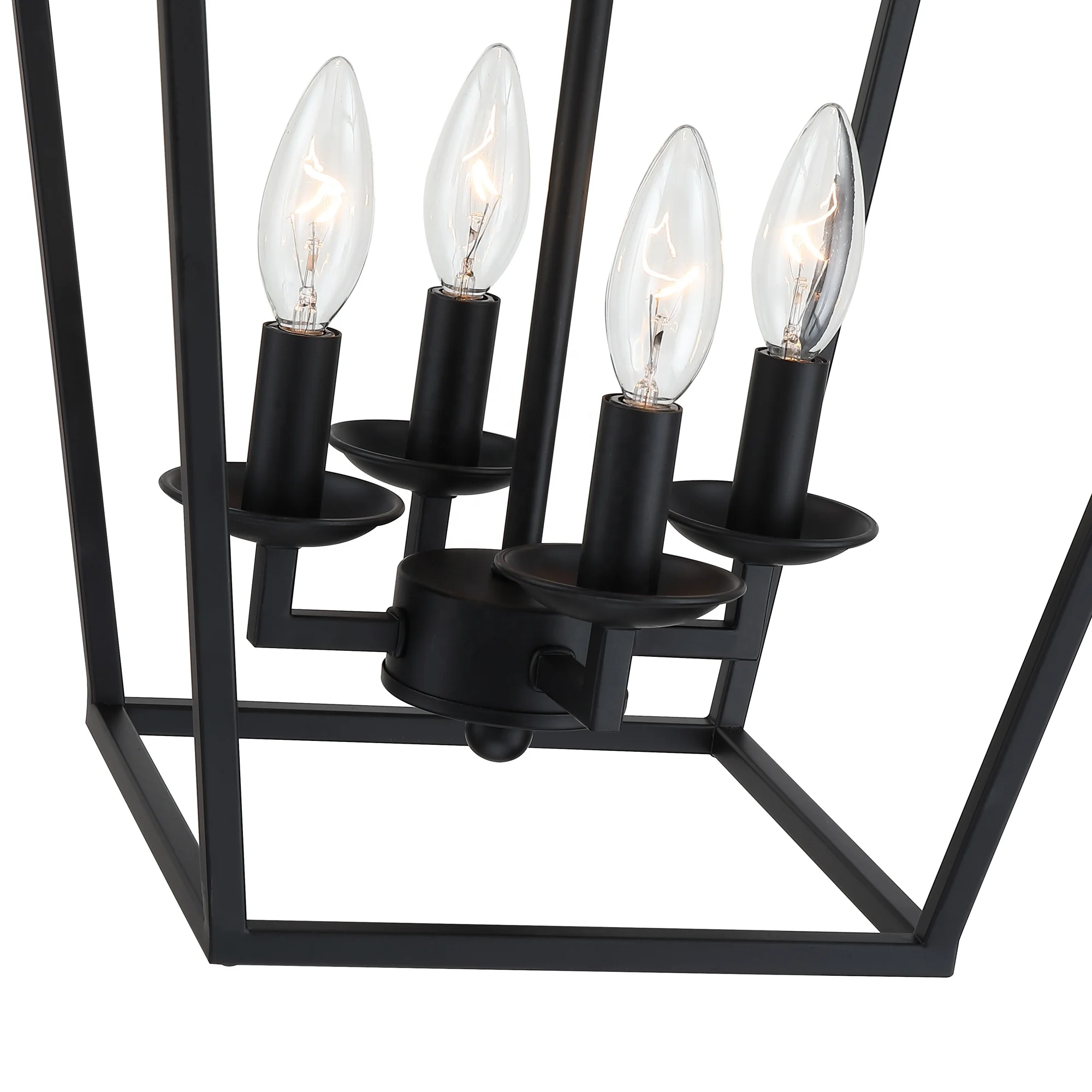 This lantern chandelier is crafted from durable steel with a sleek black finish, ensuring long-lasting quality. The adjustable hanging chain allows you to customize the height to fit your ceiling space. Compatible with E12 base bulbs (not included), this 4-light fixture supports dimming functionality, giving you the flexibility to create the perfect lighting ambiance.