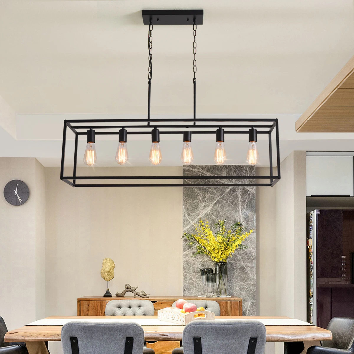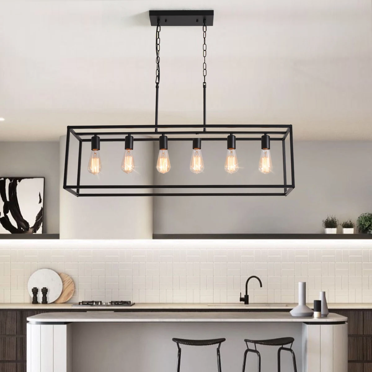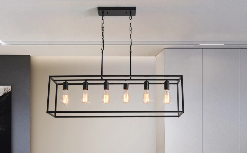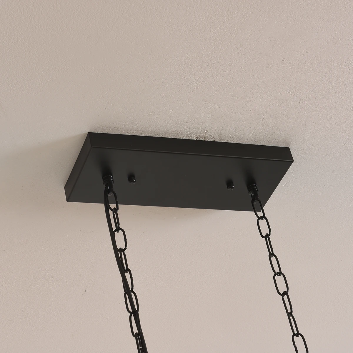 The Garwarm 6-Light Rectangle Farmhouse Chandelier combines modern simplicity with rustic charm, making it a perfect lighting solution for your kitchen island, dining room, living room, or bar area. Designed with a sleek black iron frame, this linear chandelier enhances any interior with its elegant industrial style.