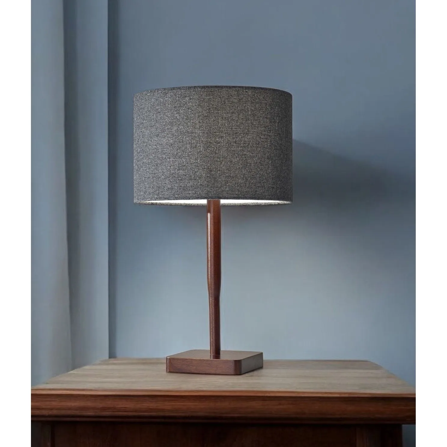 - Elegant Design: Walnut wood finish with a cylindrical dark gray fabric shade.